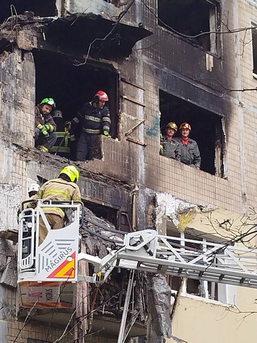 Наразі роботи з розбору аварійних конструкцій та встановлення підпор виконують у житловій багатоповерхівці, що постраждала у Солом’янському районі Києва.