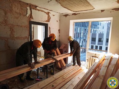 Рятувальники третього аварійно-рятувального взводу (АРВ) КАРС «Київська служба порятунку» провели демонтаж аварійних конструкцій і встановили дерев’яні підпори, щоб укріпити пошкоджені частини будівлі.