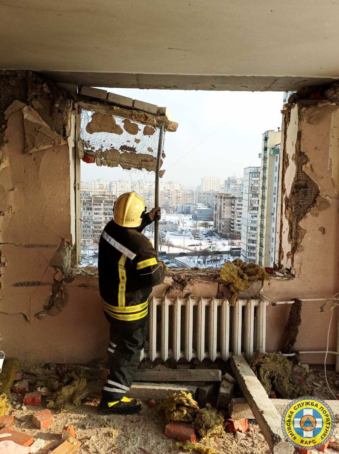 Рятувальники комунальної аварійно-рятувальної служби (КАРС) "Київська служба порятунку" сьогодні 14 січня протягом дня виконували аварійно-рятувальні роботи у будинках, що були пошкоджені внаслідок ворожих атак.