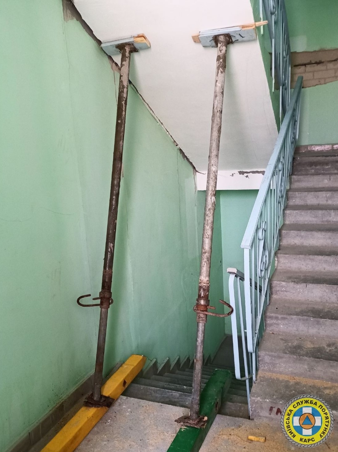 Зокрема, в житловій багатоповерхівці в Дарницькому районі встановили опірні стійки на сходових майданчиках та інших локаціях, де потрібно було укріпити бетонні конструкції для недопущення подальших руйнувань та убезпечення людей.