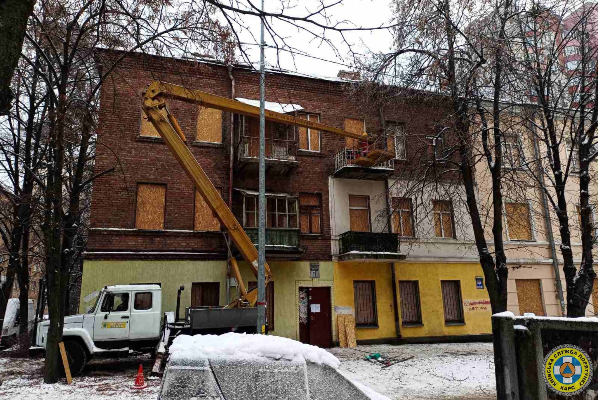 Сьогодні рятувальники комунальної аварійно-рятувальної служби (КАРС) "Київська служба порятунку" за допомогою підйомника та спецтехніки закрили вікна фанерою для зберігання тепла в будинку.