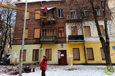 Рятувальники КАРС виконали аварійно-відновлювальні роботи у пошкодженому будинку в Солом'янському районі міста: закрили фанерою всі вікна триповерхівки.