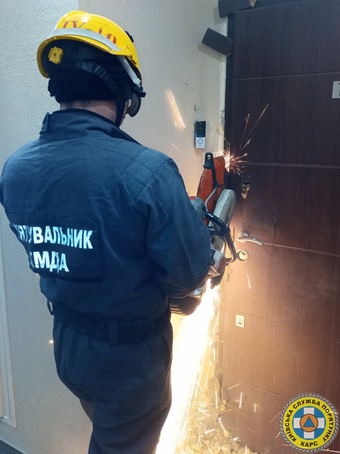 У житловому будинку в Печерському районі, куди влучили уламки й спалахнула пожежа, рятувальники деблокували двері помешкань, де перебували люди, до яких не було доступу.