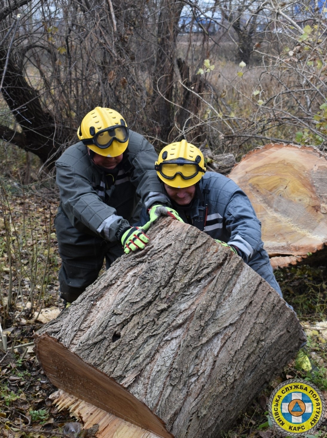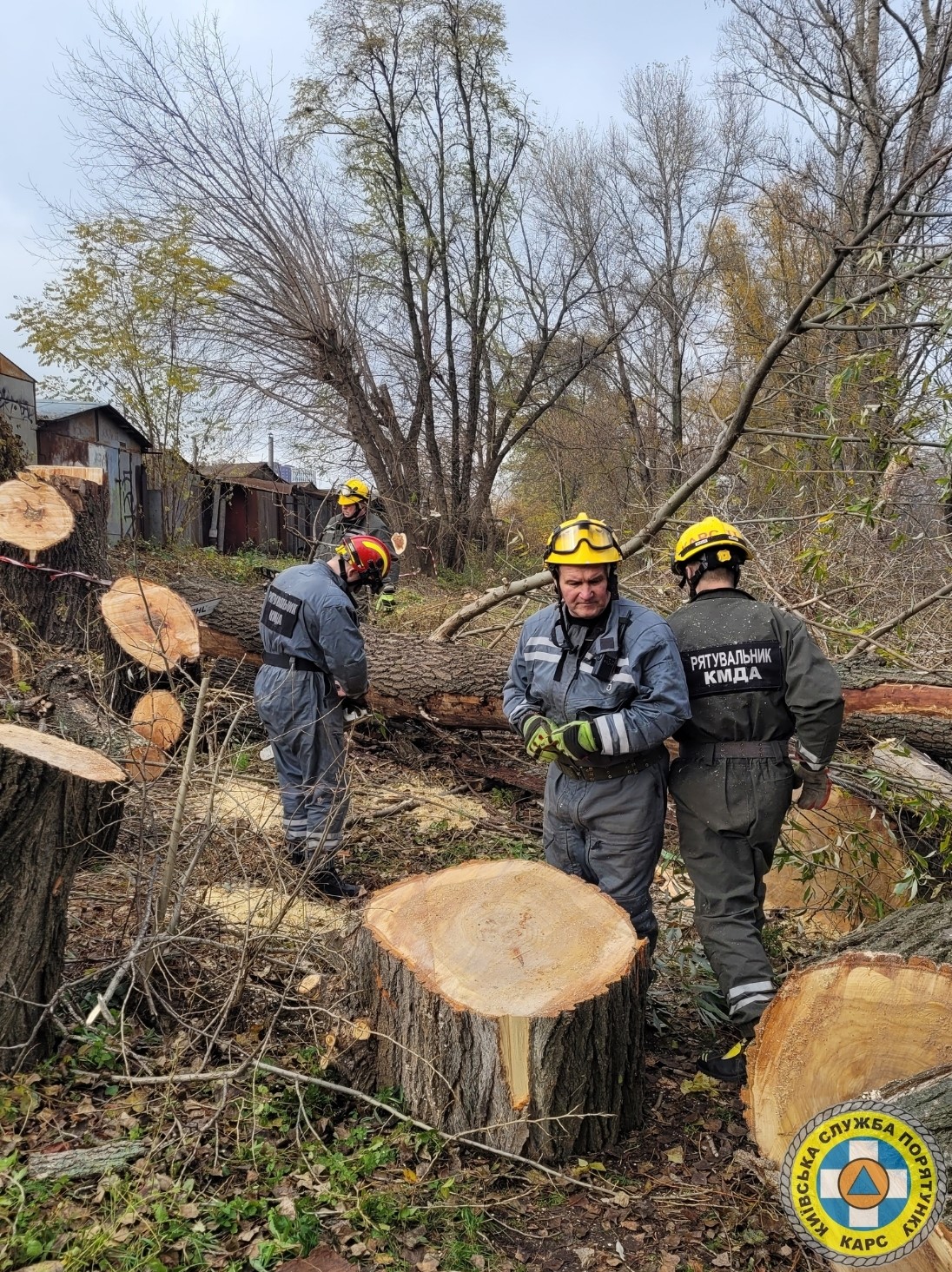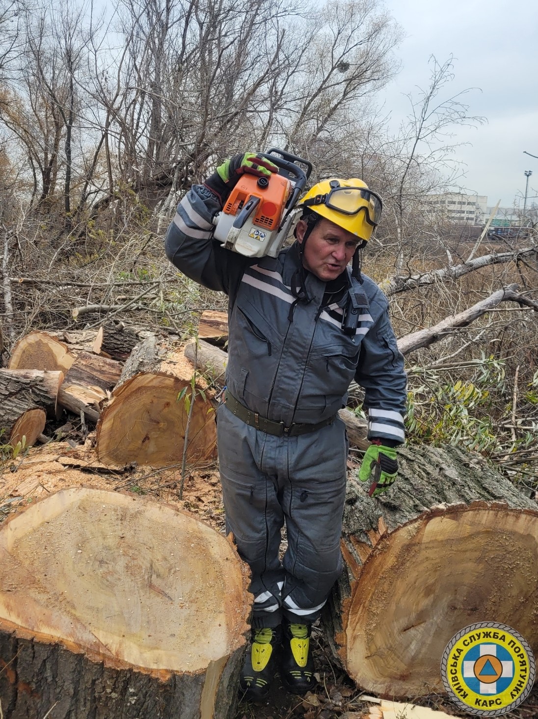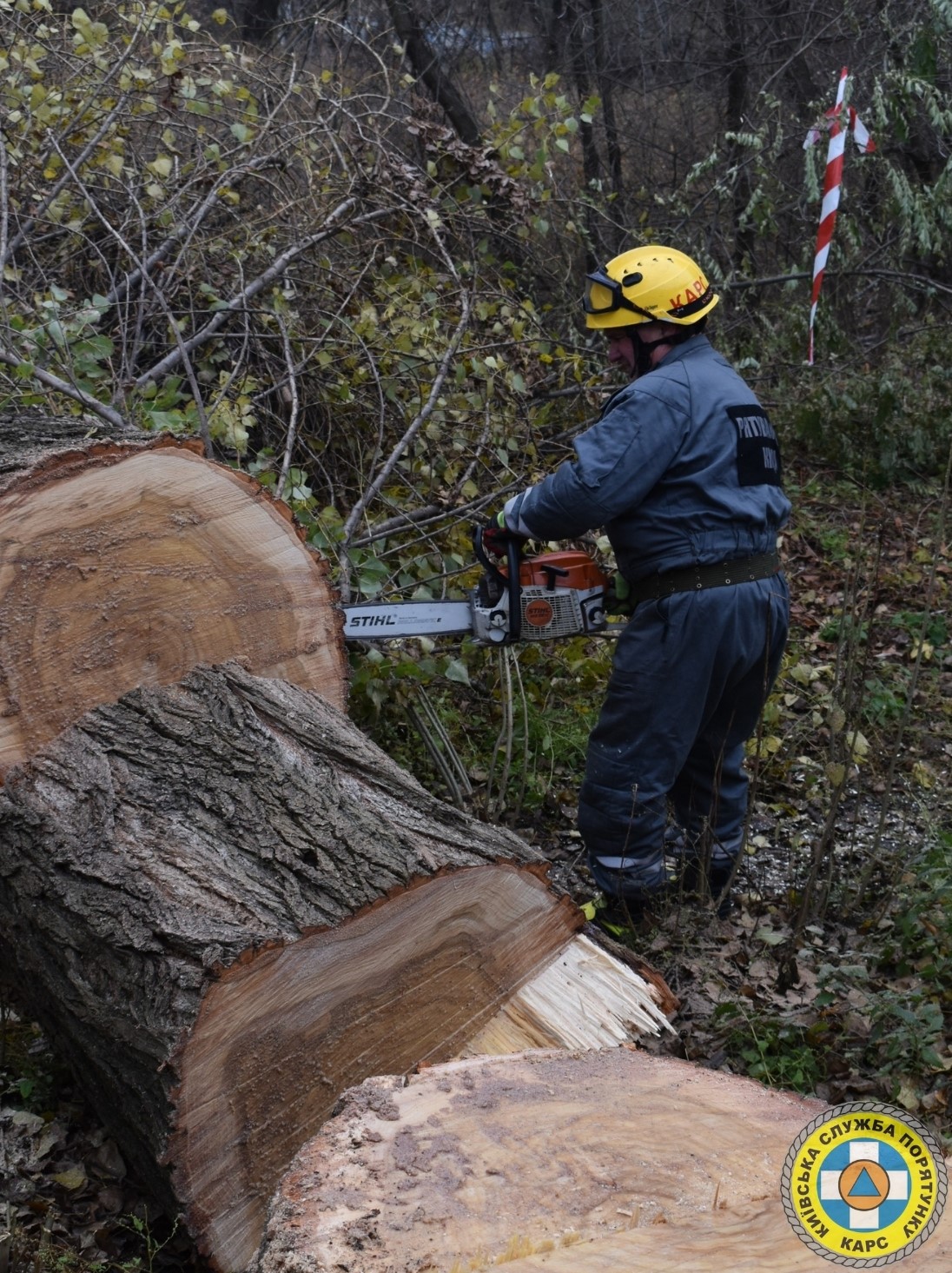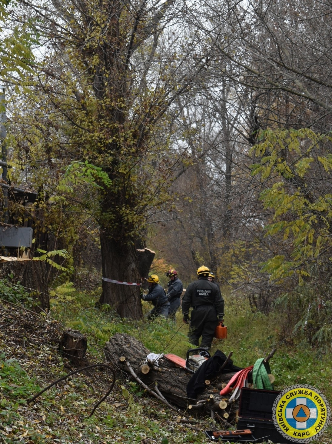 період з 07 по 10 листопада рятувальники чотирьох взводів комунальної аварійно-рятувальної служби (КАРС) «Київська служба порятунку» виїжджали на роботи в Оболонський район, де на території, прилеглої до гаражно-будівельного кооперативу "Луговий", потрібно було видалити аварійні сухостійкі дерева.