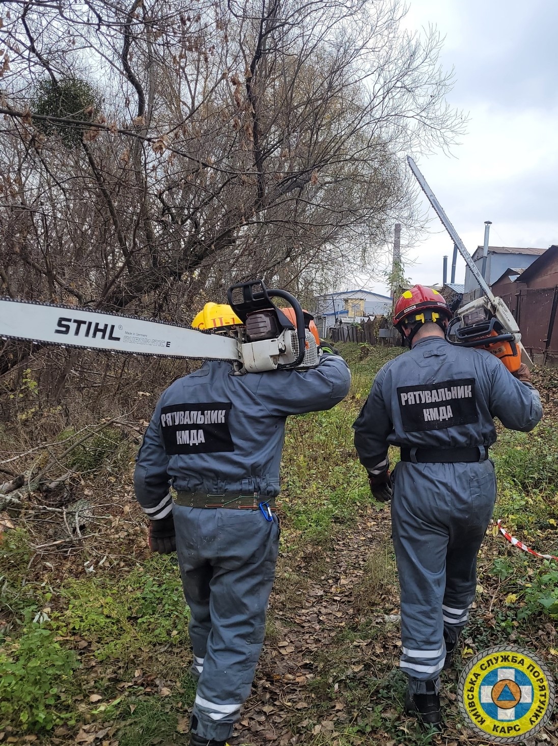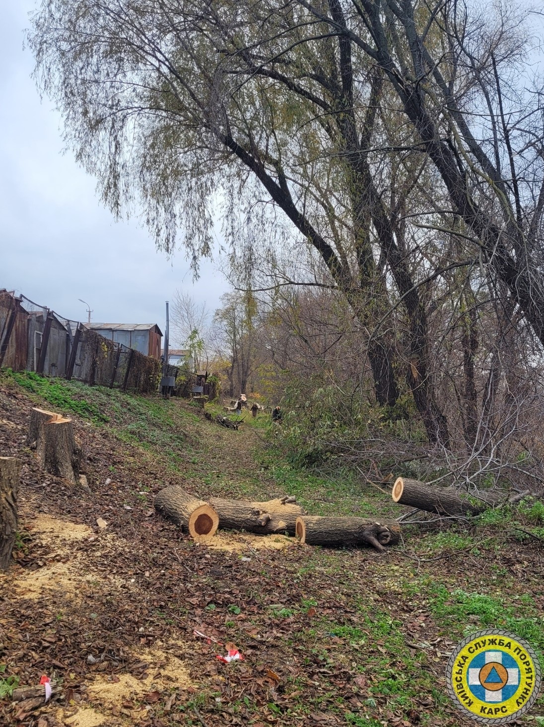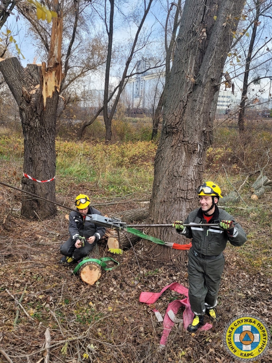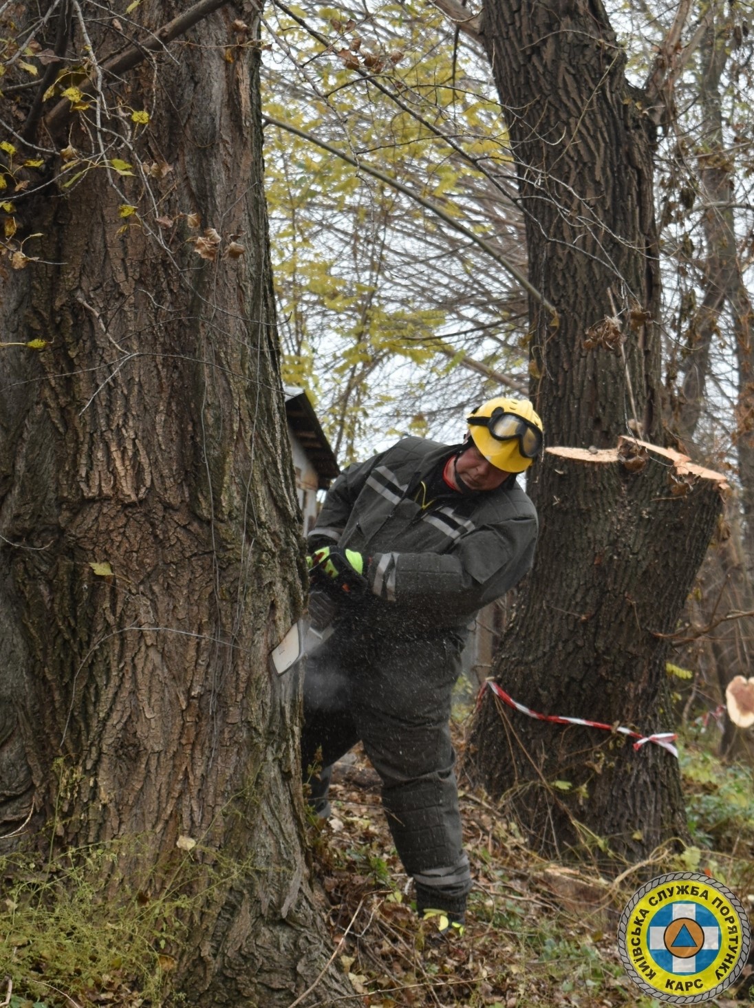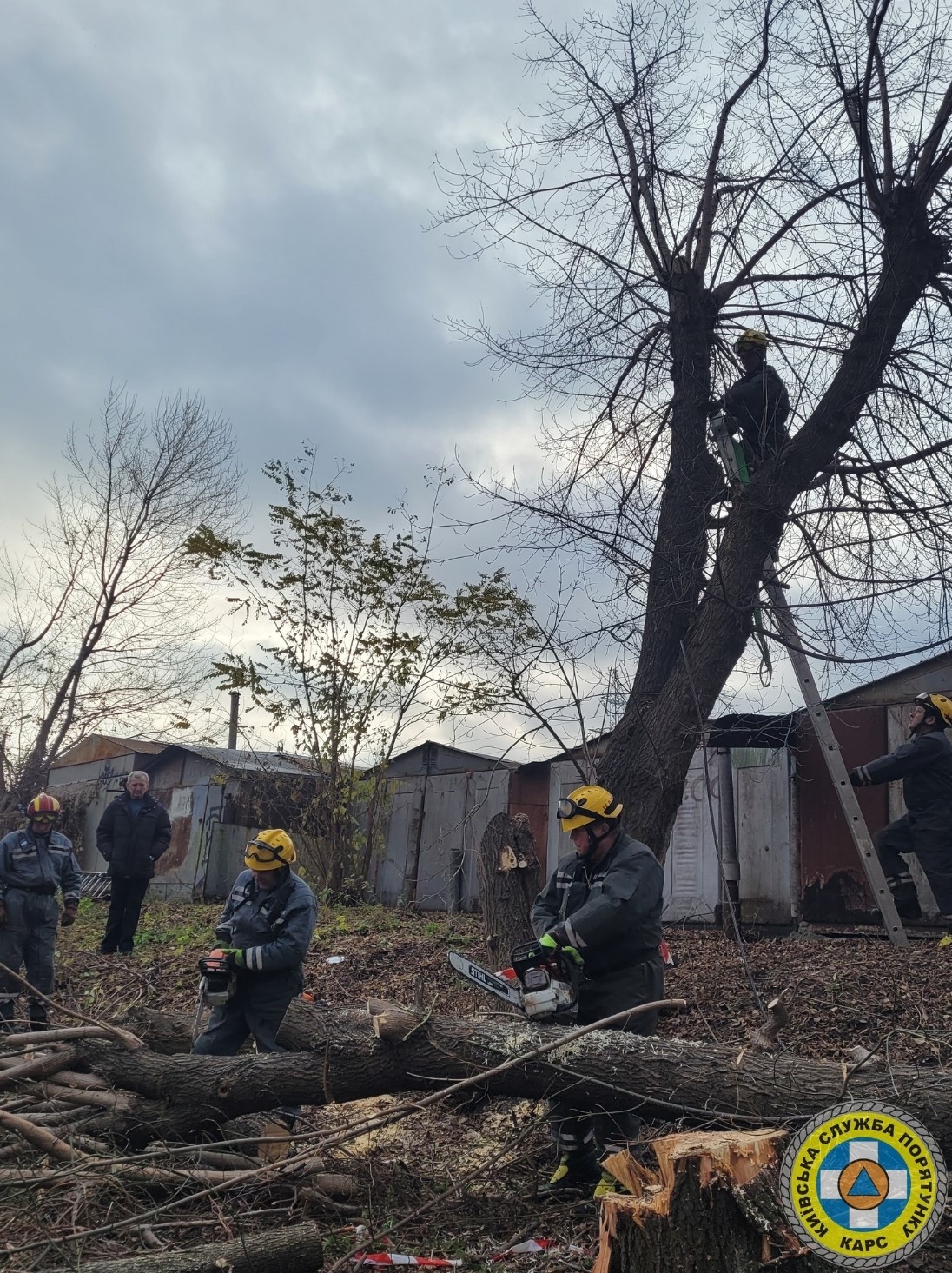 період з 07 по 10 листопада рятувальники чотирьох взводів комунальної аварійно-рятувальної служби (КАРС) «Київська служба порятунку» виїжджали на роботи в Оболонський район, де на території, прилеглої до гаражно-будівельного кооперативу "Луговий", потрібно було видалити аварійні сухостійкі дерева.